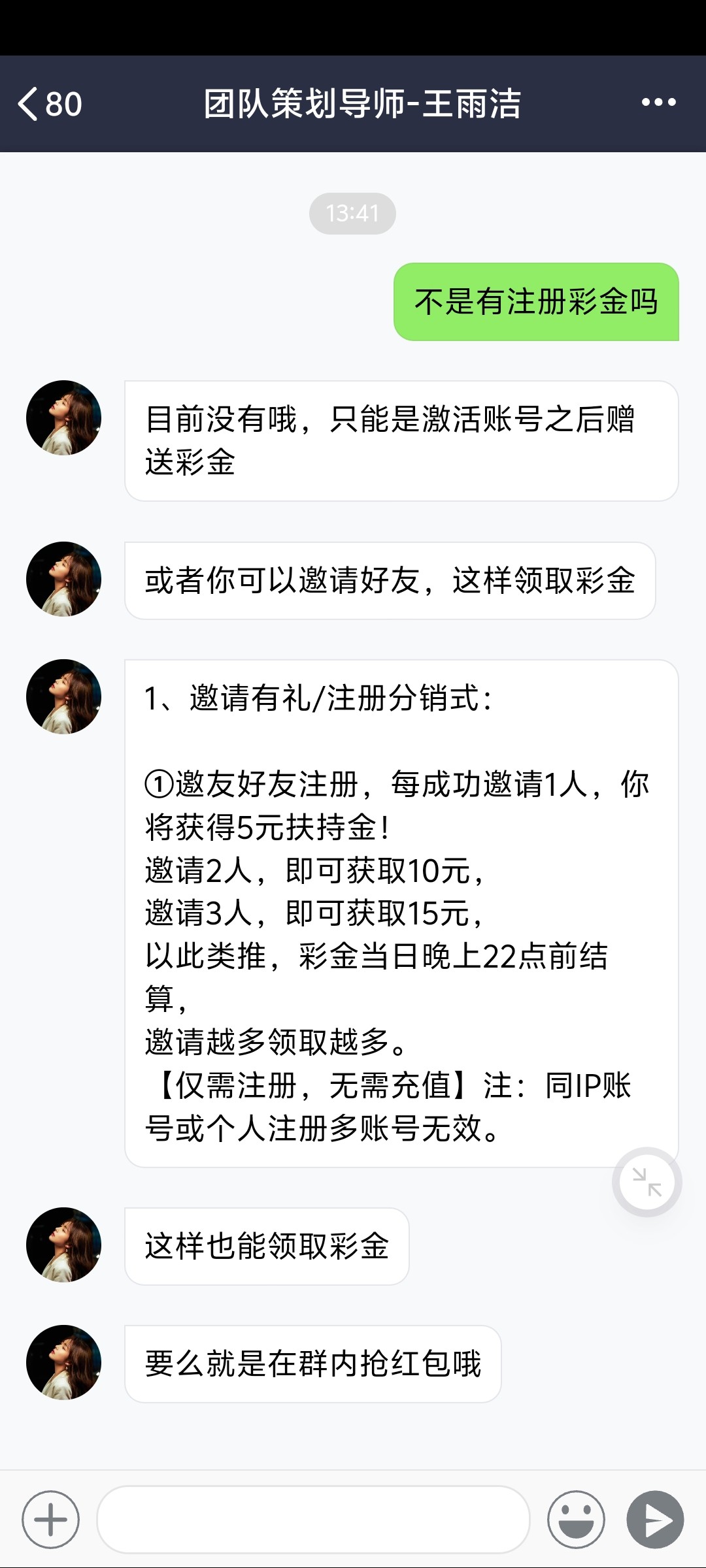 小白兔 你想什么呢?我没有领取过一分钱人头费哈你可以联系可以咨询是否我拿过人头费 你拿截图过来 我不想骂人兄弟 大家都不容易 我是给你们白嫖的 你们一分钱不充的 我拿什么人头费?